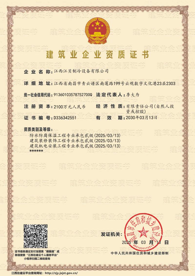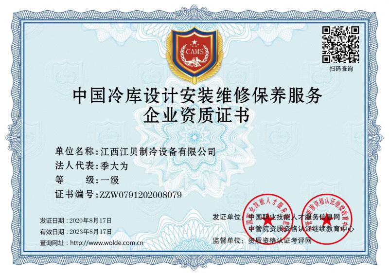 江贝冷库安装资质证书